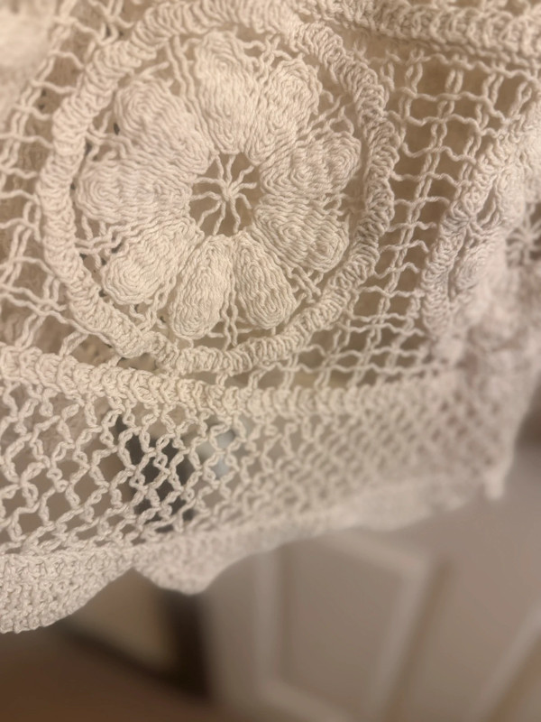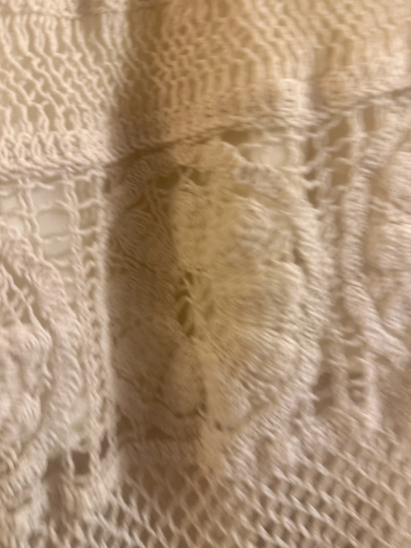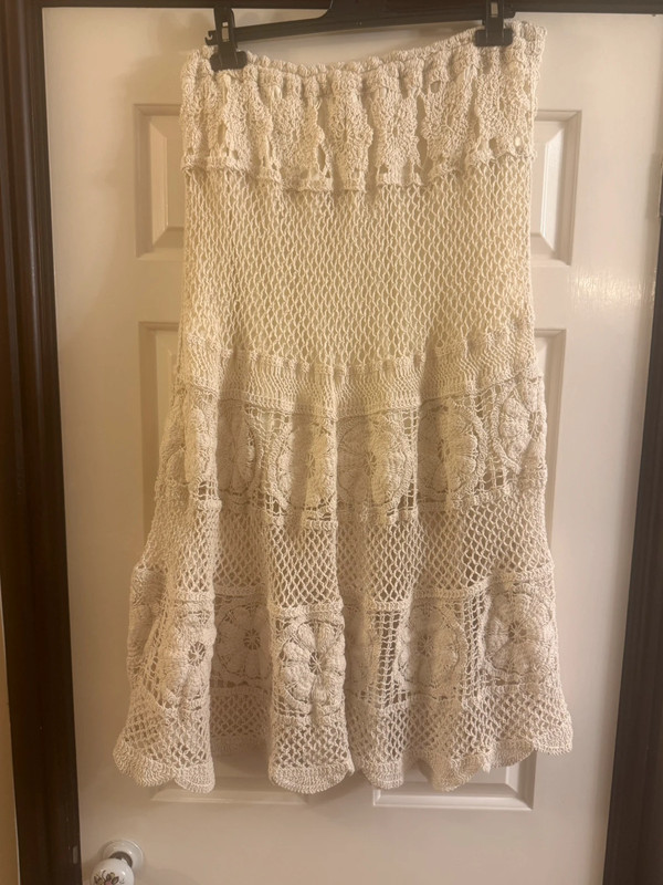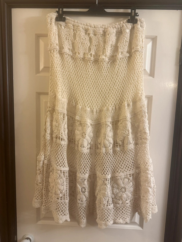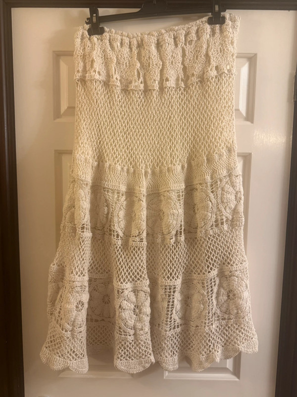 Lined in polyester fabric. Midi length . Waist measures 34”, elastic band. Can fit up to size 14/16
