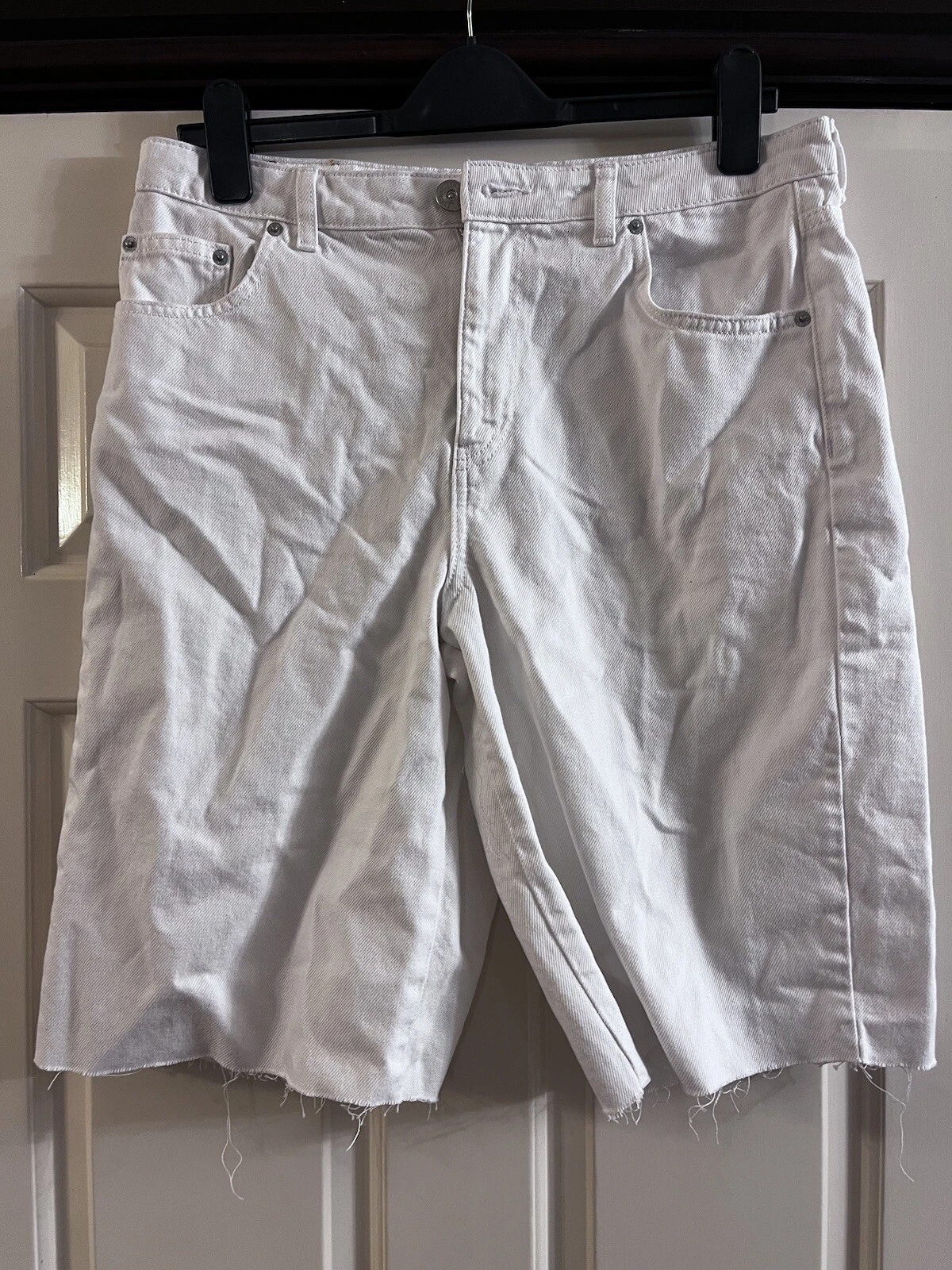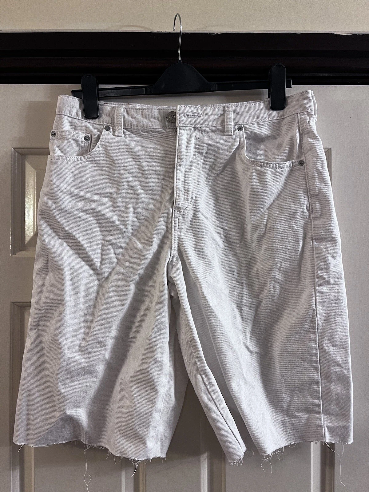 / Bdg White Denim Shorts Frayed Hem Knee Length. Ladies
