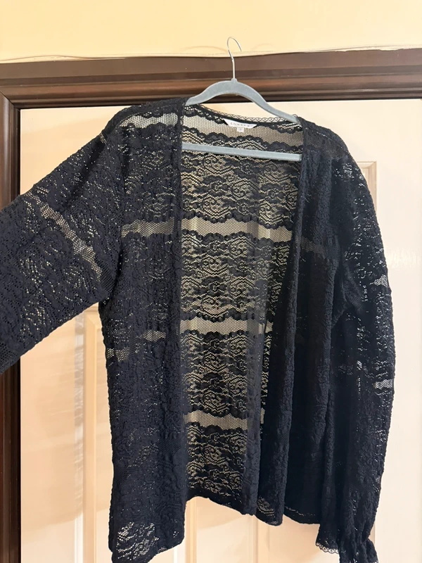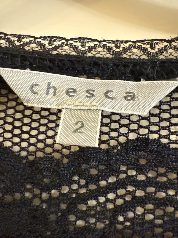 Lace look jacket with elasticated wrist detail. Shoulder 20”, length 27 Chesca size 2