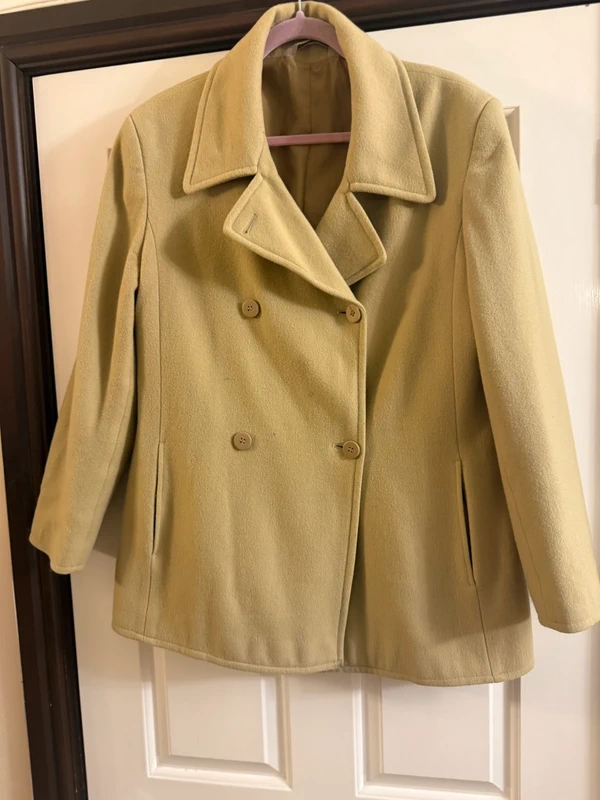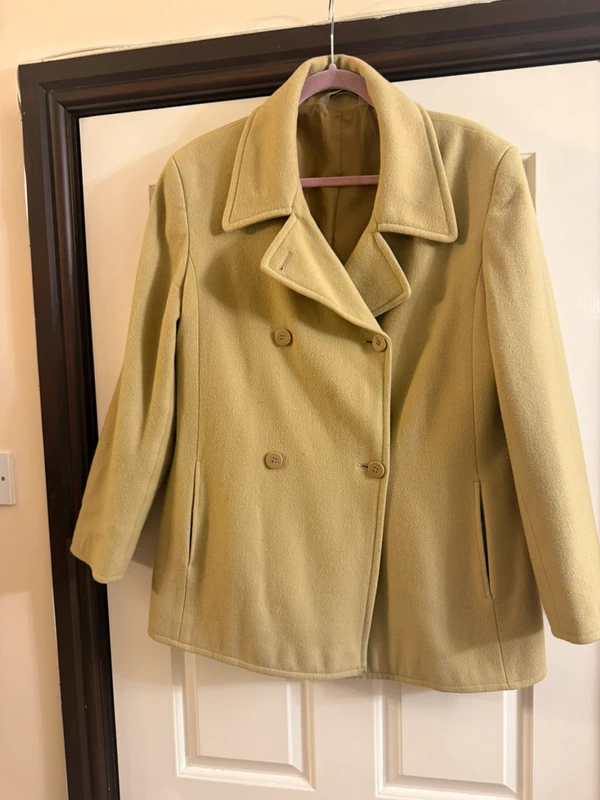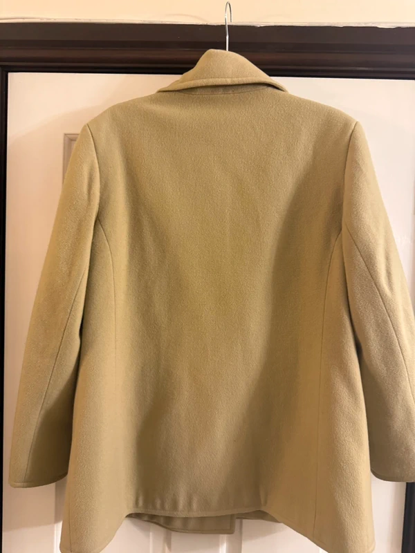 Double breasted . Lined. Good condition. Shoulder measures 18”, length 29