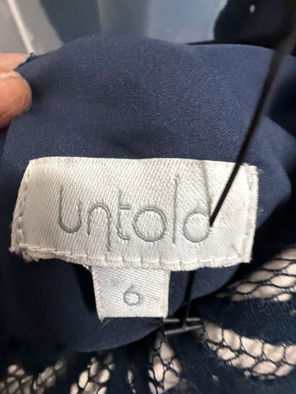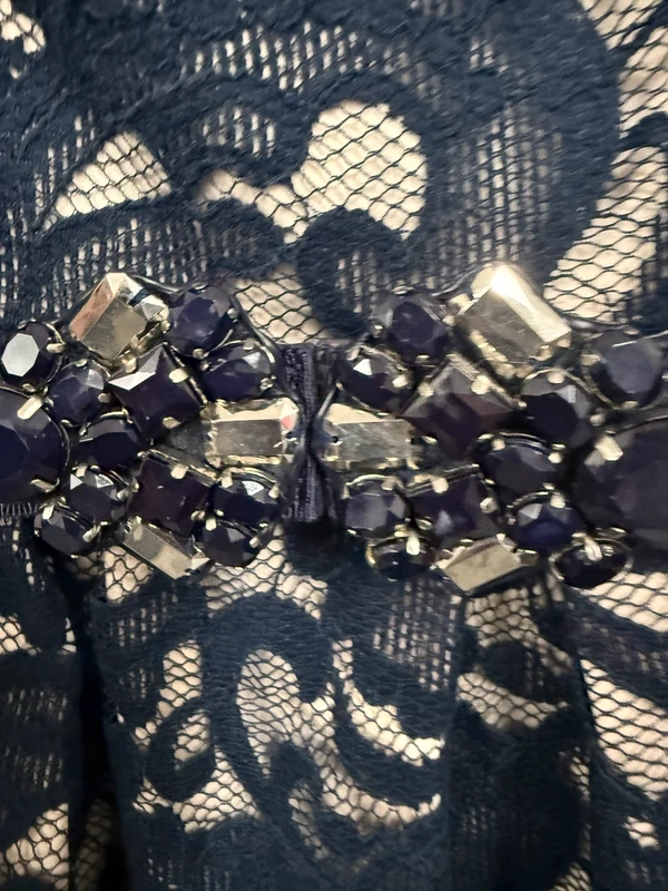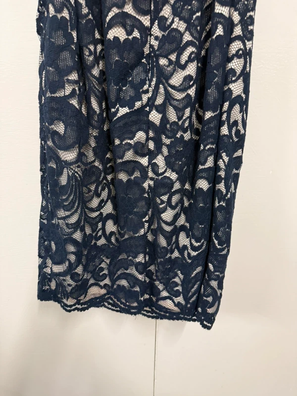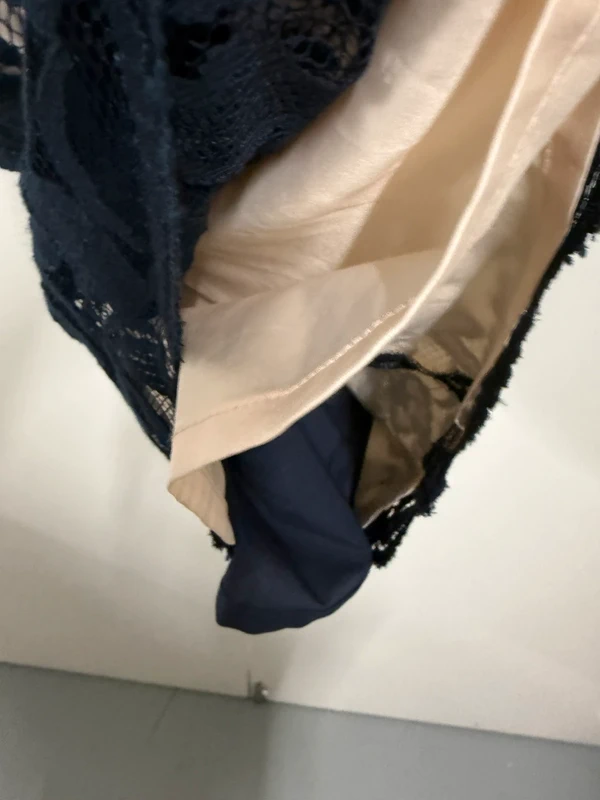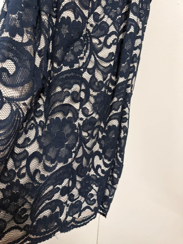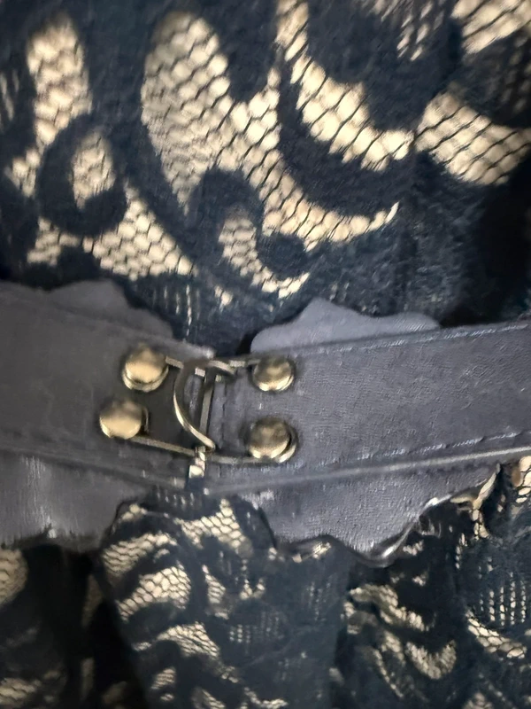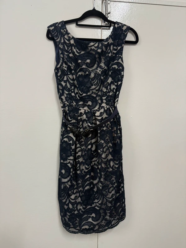 Lace over beige fabric . Double lined dress. Ornate belt . Light lipstick stain (see last picture) in inner lining but perfect all round