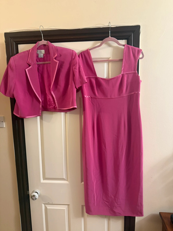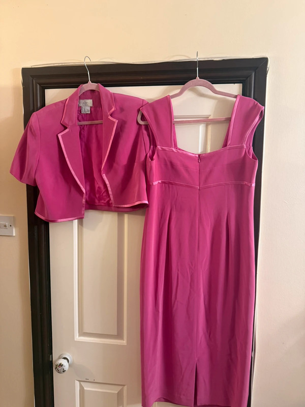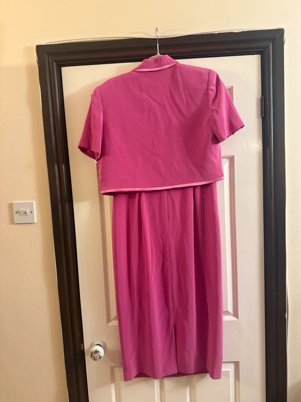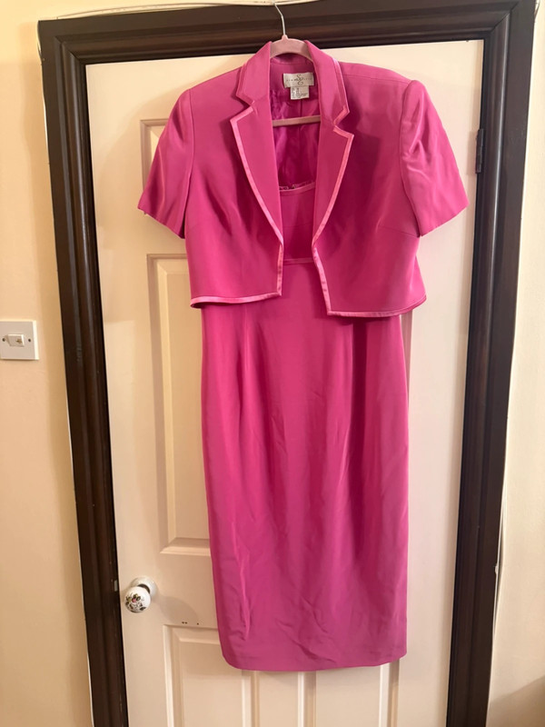 Lined suit. Dress has slit . Short sleeved jacket , sleeveless dress. Worn once .
